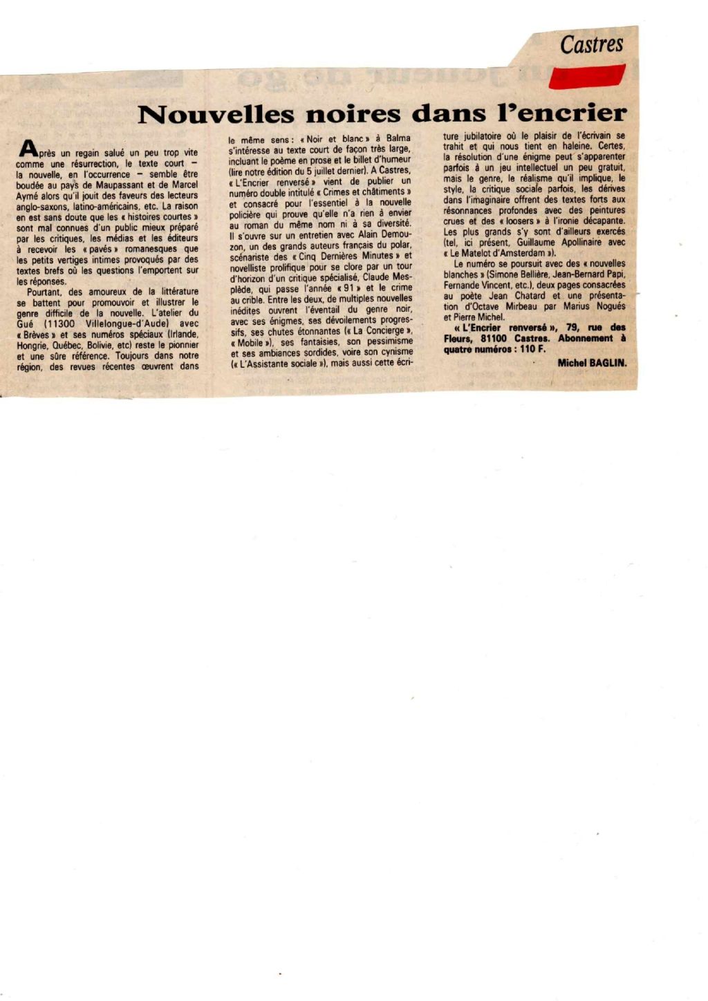 [68 pages] « Crimes et châtiments » : Entretien avec Alain Demouzon ; Les flics ont peur dans le noir, Alain Demouzon ; Mobile, Parviz ; La concierge, Françoise Urban-Menninger ; Soupçonnée, François Laur ; Nom de l’assassin : Clavier Jacques, Didier Nordon ; Le coq un dimanche, Jean-Claude Lecat ; L’assistante sociale, Jean-Michel Blatrier ; Le crime passé au crible, Claude Mesplède ; Nuits chaudes, Guillaume Thiberge ; Les rails, Guy Chaty ; L’Aerius, machine volante, Jean-Bernard Papi ; Escale aux îles Lavezzi, Simone Bellière ; La serre, Fernande Vincent ; Leila Cambon, Olivier Delau ; « Contes cruels » de Mirbeau, Marius Noguès ; Octave Mirbeau, Pierre Michel ; poésies de Jean Chatard.