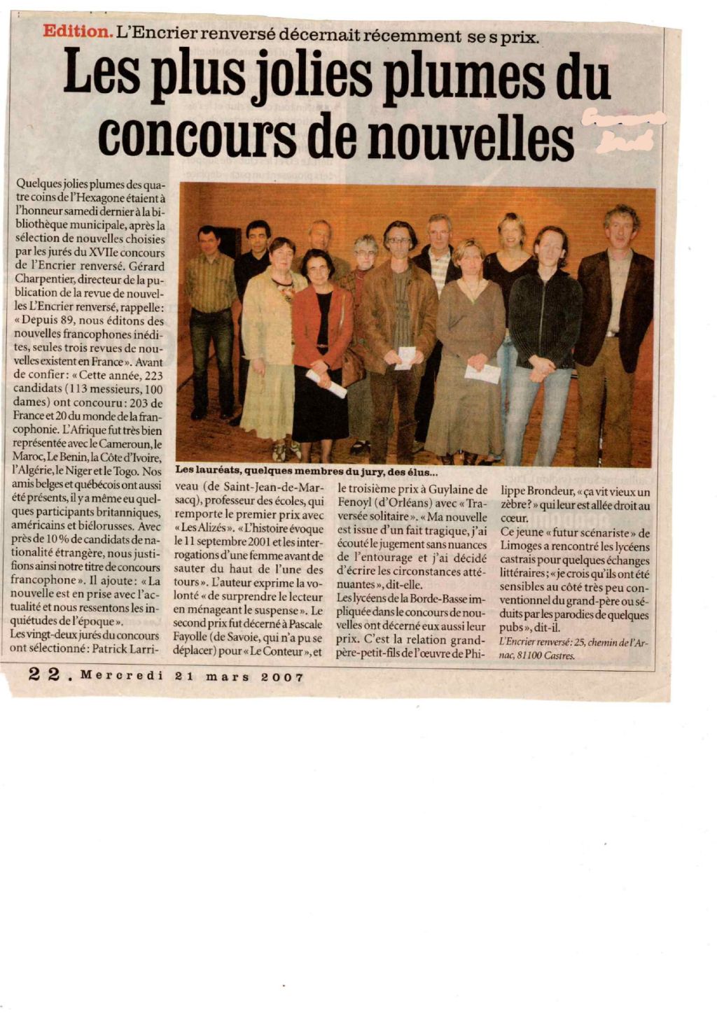 [52 pages] Concours 2006 : Les alizés, Patrick Larriveau ; Le conteur, Pascale Corde-Fayolle ; Traversée solitaire, Guylaine de Fenoyl ; Prix Lycéens 2006 : Ça vit vieux, un zèbre ?, Philippe Brondeur ; Service des encombrants, Désirée Boillot ; Algérie mon algie, Franck Garot ; L’escapade, Louis Vuitton ; La vie à pile ou face, Jean Calbrix ; Angie, Thibault Pairis ; Que du bonheur !, Cristina Triumph. Rubrique : A propos de bottes.
