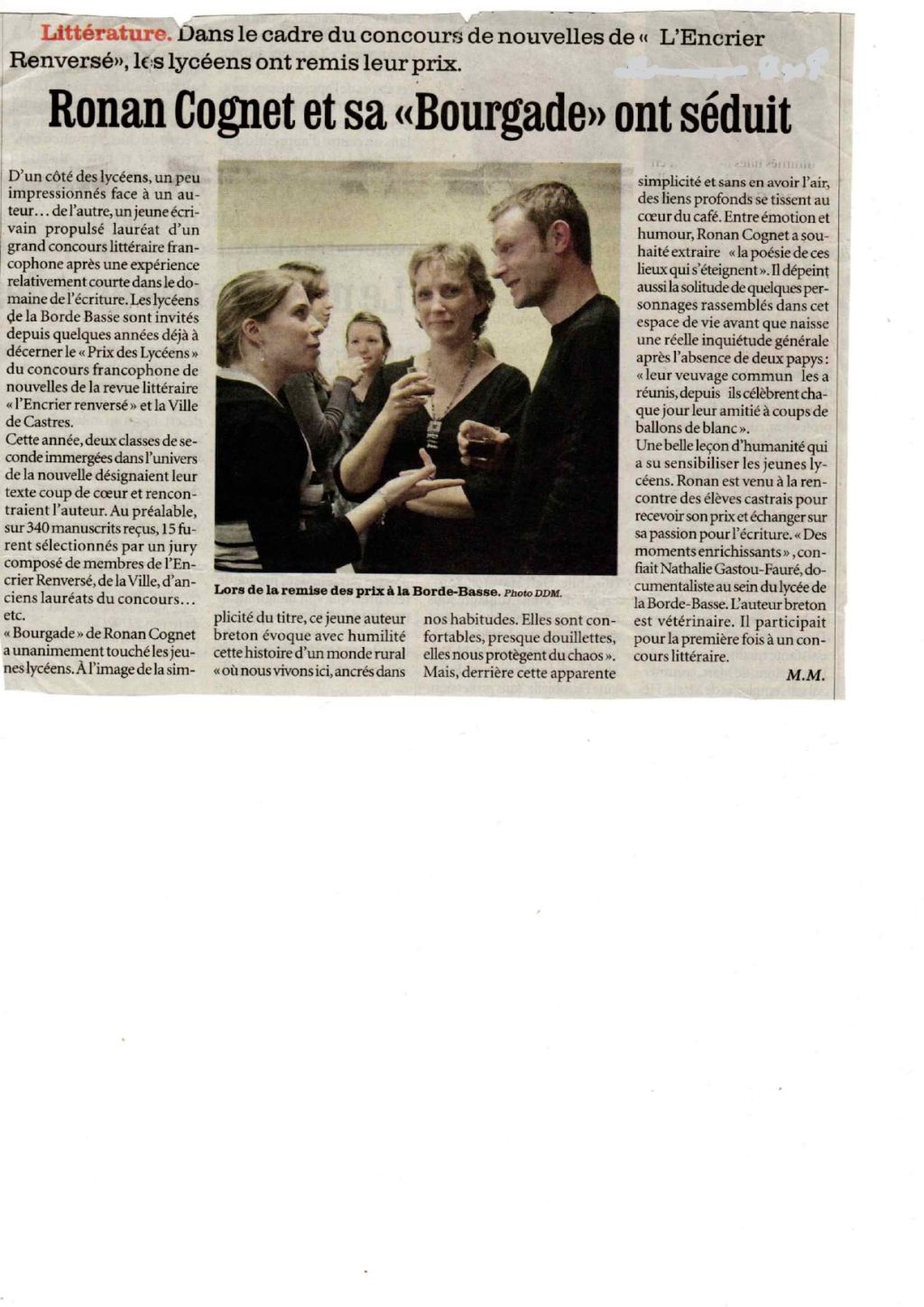 [52 pages] Concours 2008 : Le guéridon Napoléon III d’Émilienne de Saint-Éloi, Julie Matignon ; La boîte, Annick Demouzon ; Le peintre d’Ostende, Patrick Ledent ; Prix Lycéens 2008 : Bourgade, Ronan Cognet ; Le revenant de Tchouvachie, Francine Bibian ; Les sirènes, Anne Deniau ; Esprit de famille, Alain Jacquet ; Les Trois-bras, Gérard Avril ; Pour une poignée de marrons, Élodie Sauvage ; Là-bas, Christine Gire ; Prix Encres de crimes 2008 : Les caryatides, Marie-Claude Varechon. Rubrique : A propos de bottes.