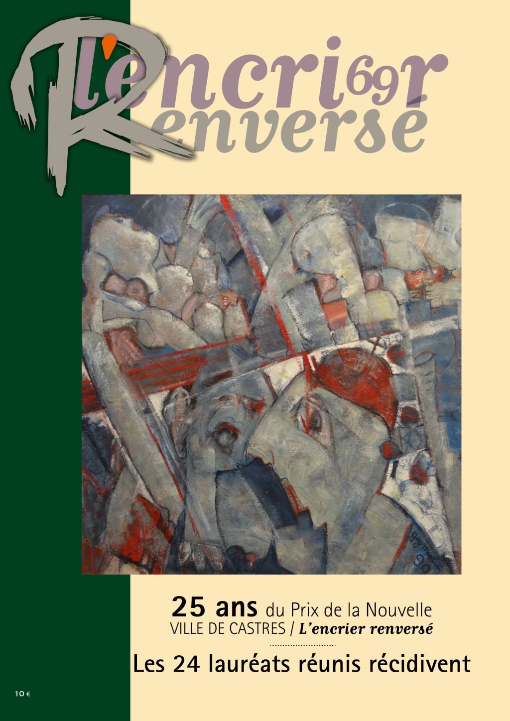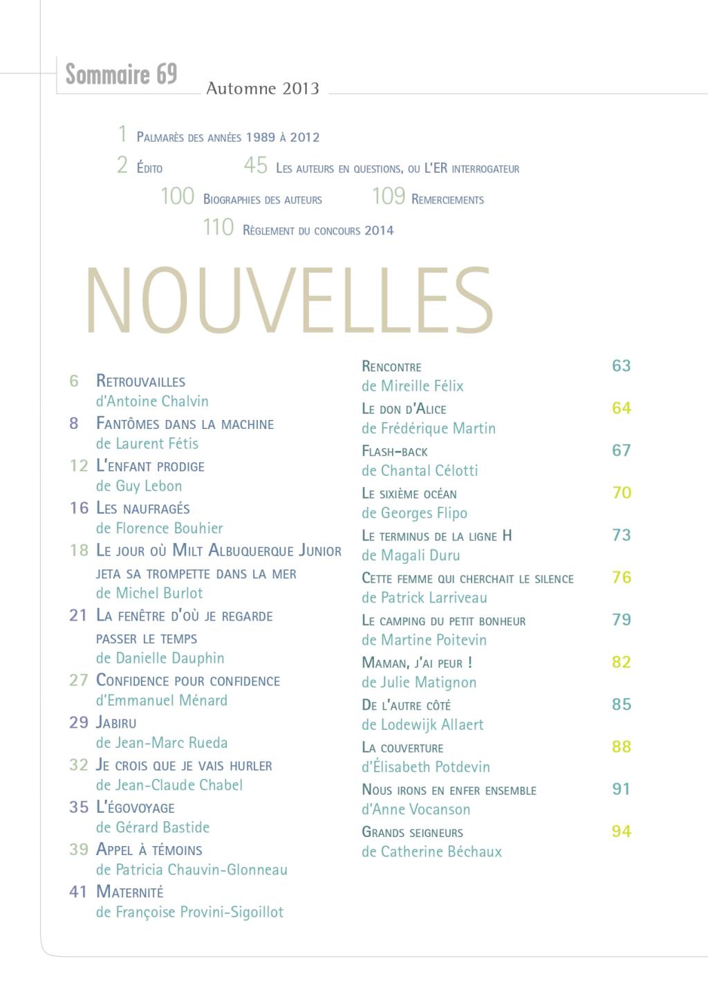 [116 pages] « 25 ans du concours Ville de Castres/L’encrier renversé ». Retrouvailles, Antoine Chalvin ; Fantômes dans la machine, Laurent Fétis ; L’enfant prodige, Guy Lebon ; Les naufragés, Florence Bouhier ; Le jour où Milt Albuquerque Junior jeta sa trompette dans la mer, Michel Burlot ; La fenêtre d’où je regarde passer le temps, Danielle Dauphin ; Confidence pour confidence, Emmanuel Ménard ; Jabiru, Jean-Marc Rueda ; Je crois que je vais hurler, Jean-Claude Chabel ; L’egovoyage, Gérard Bastide ; Appel à témoins, Patricia Chauvin-Glonneau ; Maternité, Françoise Provini-Sigoillot ; « Les auteurs en questions… », entretiens ; Rencontre, Mireille Félix ; Le don d’Alice, Frédérique Martin ; Flash-back, Chantal Celotti ; Le sixième océan, Georges Flipo ; Le terminus de la ligne H, Magali Duru ; Cette femme qui cherchait le silence, Patrick Larriveau ; Le camping du petit bonheur, Martine Poitevin ; Maman, j’ai peur !, Julie Matignon ; De l’autre côté, Lodewijk Allaert ; La couverture, Élisabeth Potdevin ; Nous irons en enfer ensemble, Anne Vocanson ; Grands seigneurs, Catherine Béchaux.