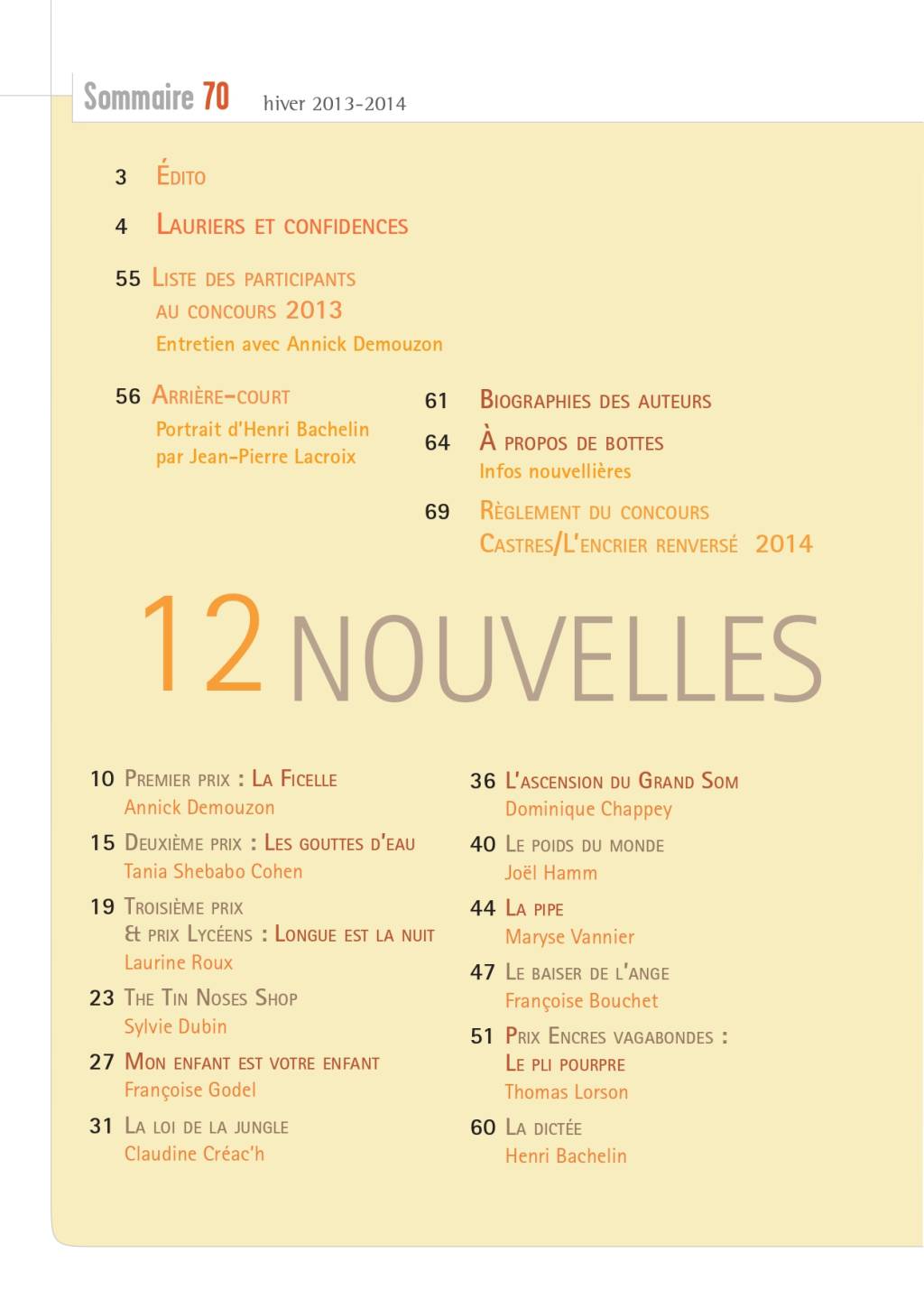 [72 pages] Concours 2013 : La Ficelle, Annick Demouzon ; Les gouttes d’eau, Tania Shebabo Cohen ; Longue est la nuit, Laurine Roux ; The Tin Noses Shop, Sylvie Dubin ; Mon enfant est votre enfant, Françoise Godel ; La loi de la jungle, Claudine Créac’h ; L’ascension du Grand Som, Dominique Chappey ; Le poids du monde, Joël Hamm ; La pipe, Maryse Vannier ; Le baiser de l’ange, Françoise Bouchet ; Prix Encres vagabondes 2013 : Le pli pourpre, Thomas Lorson. Rubriques : Lauriers et confidences, Arrière-court (La dictée, Henri Bachelin, portrait par Jean-Pierre Lacroix), A propos de bottes...