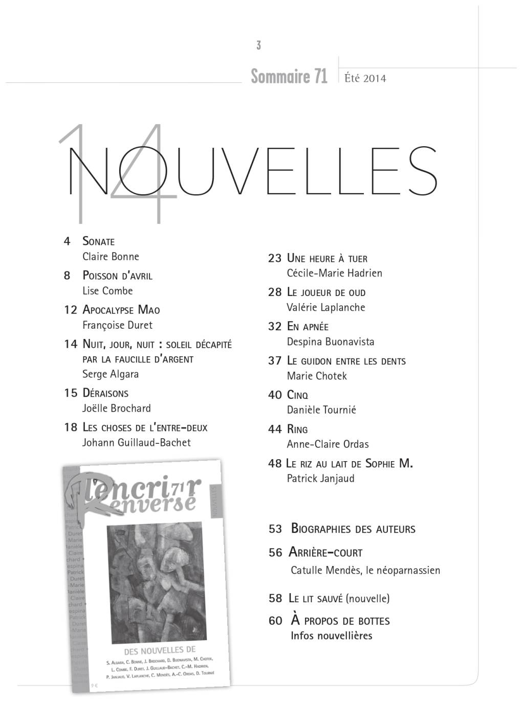 [64 pages] Sonate, Claire Bonne ; Poisson d’avril, Lise Combe ; Apocalypse Mao, Françoise Duret ; Nuit, jour, nuit : soleil décapité par la faucille d’argent, Serge Algara ; Déraisons, Joëlle Brochard ; Les choses de l’entre-deux, Johann Guillaud-Bachet ; Une heure à tuer, Cécile-Marie Hadrien ; Le joueur de oud, Valérie Laplanche ; En apnée, Despina Buonavista ; Le guidon entre les dents, Marie Chotek ; Cinq, Danièle Tournié ; Ring, Anne-Claire Ordas ; Le riz au lait de Sophie M., Patrick Janjaud. Rubriques : Arrière-court (Le lit sauvé, Catulle Mendès), A propos de bottes...