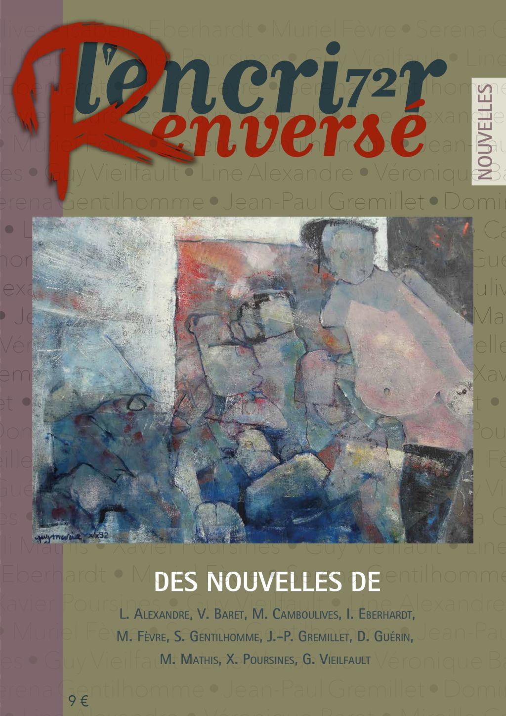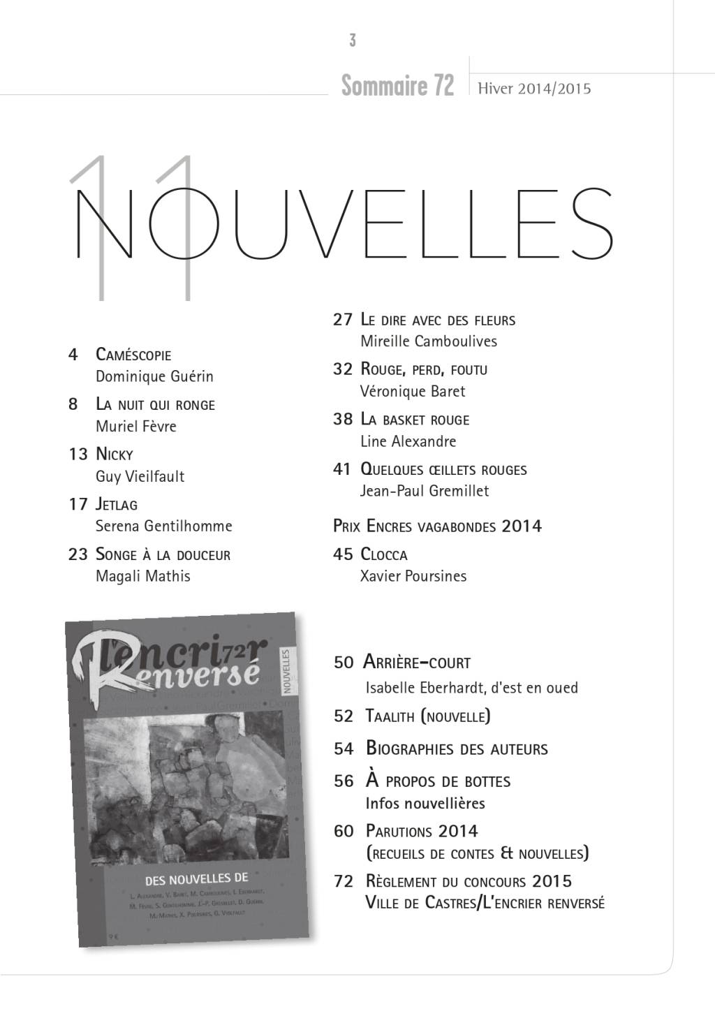 [74 pages] Caméscopie, Dominique Guérin ; La nuit qui ronge, Muriel Fèvre ; Nicky, Guy Vieilfault ; Jetlag, Serena Gentilhomme ; Songe à la douceur, Magali Mathis ; Le dire avec des fleurs, Mireille Camboulives ; Rouge, perd, foutu, Véronique Baret ; La basket rouge, Line Alexandre ; Quelques œillets rouges, Jean-Paul Gremillet ; Prix Encres vagabondes 2014 : Clocca, Xavier Poursines. Rubriques : Arrière-court (Taalith, Isabelle Eberhardt), A propos de bottes...