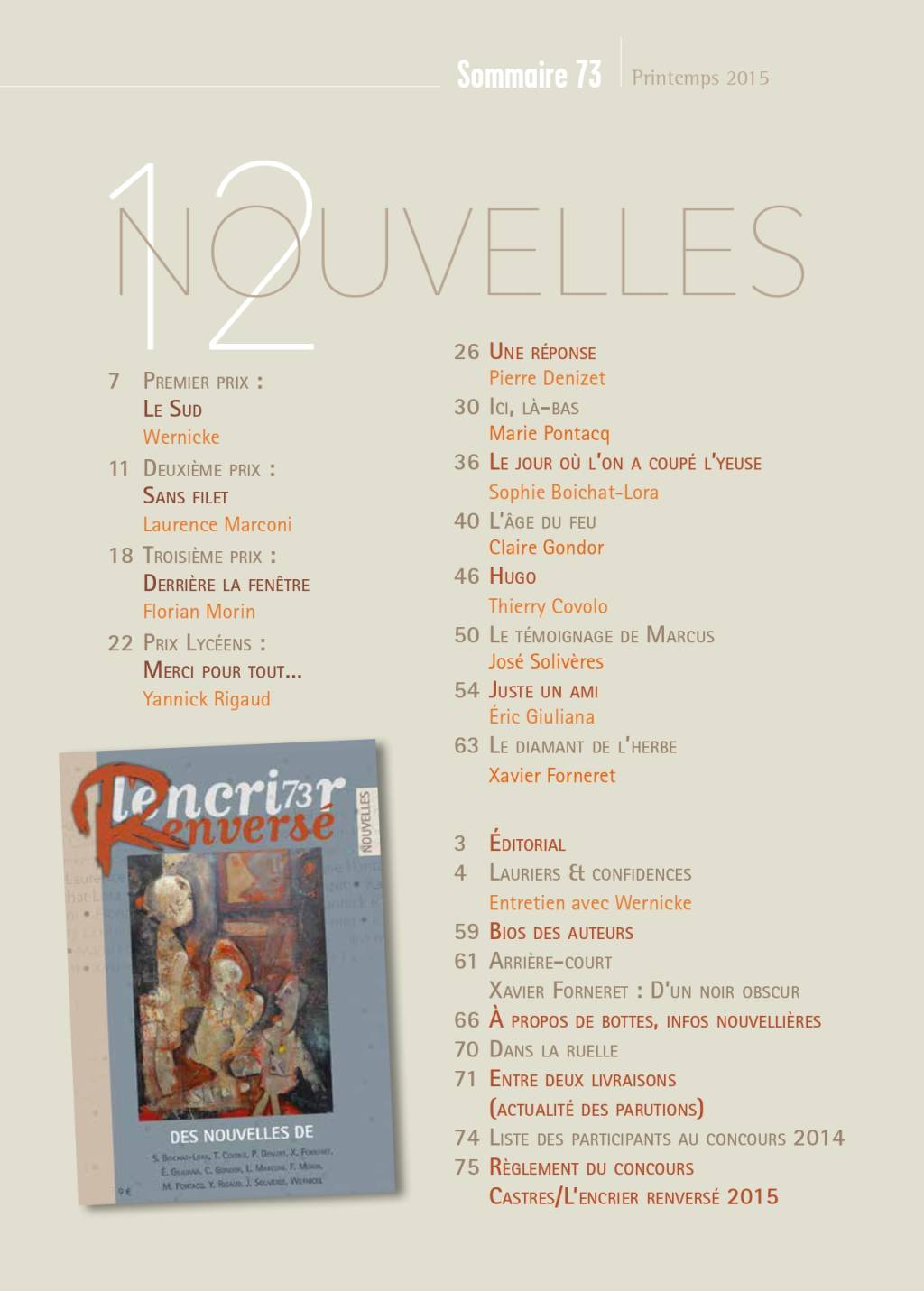 [78 pages] Concours 2014 : Le sud, Wernicke ; Sans filet, Laurence Marconi ; Derrière la fenêtre, Florian Morin ; Merci pour tout, Yannick Rigaud ; Une réponse, Pierre Denizet ; Ici, là-bas, Marie Pontacq ; Le jour où l’on a coupé l’yeuse, Sophie Boichat-Lora ; L’âge du feu, Claire Gondor ; Hugo, Thierry Covolo ; Le témoignage de Marcus, José Solivères ; Juste un ami, Éric Giuliana. Rubriques : Lauriers et confidences, Arrière-court (Le diamant de l'herbe, Xavier Forneret), Dans la ruelle, A propos de bottes...