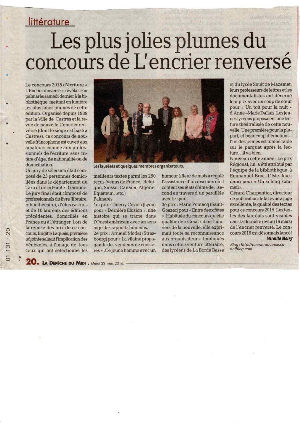 [76 pages] Concours 2015 : Dernière illusion, Thierry Covolo ; La vilaine propagande des vendeurs de croisières, Arnaud Modat ; Entre deux fêtes, Marie Pontacq ; Prix Lycéens 2015 : Un toit pour la nuit, Anne-Marie Dallais ; Au moindre galhauban, Sophie Chalandre-Saint-Martin ; Garçon manqué, Lise Combe ; Là-bas, tu verras…, Muriel Fèvre ; Une pensée pour Daniel, Alain Dhotel ; La lettre silencieuse, Simone Salgas ; Un si long sommeil, Emmanuel Broc ; Le vivier, Guy Vieilfault. Rubriques : Lauriers et confidences, Dans la ruelle, A propos de bottes...