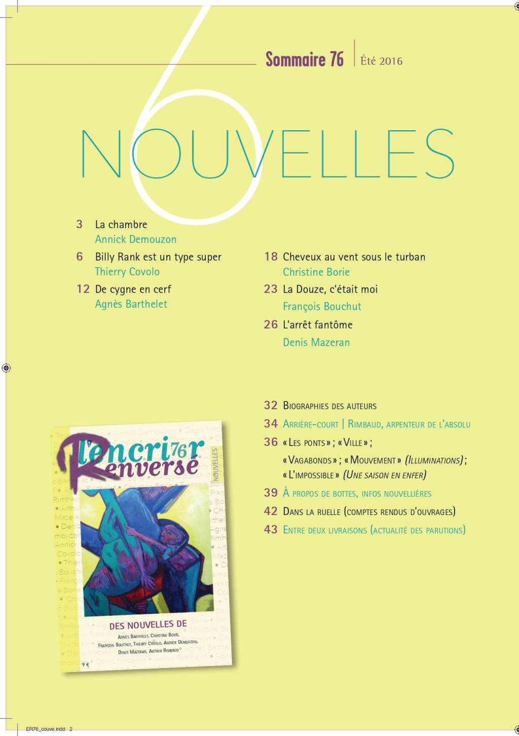 [50 pages] La chambre, Annick Demouzon ; Billy Rank est un type super, Thierry Covolo ; De cygne en cerf, Agnès Barthelet ; Cheveux au vent sous le turban, Christine Borie ; La Douze, c’était moi, François Bouchut ; L’arrêt fantôme, Denis Mazeran. Rubriques Arrière-court (Les ponts ; Ville ; Vagabonds ; Mouvement ; L'impossible, Arthur Rimbaud), Dans la ruelle, A propos de bottes...