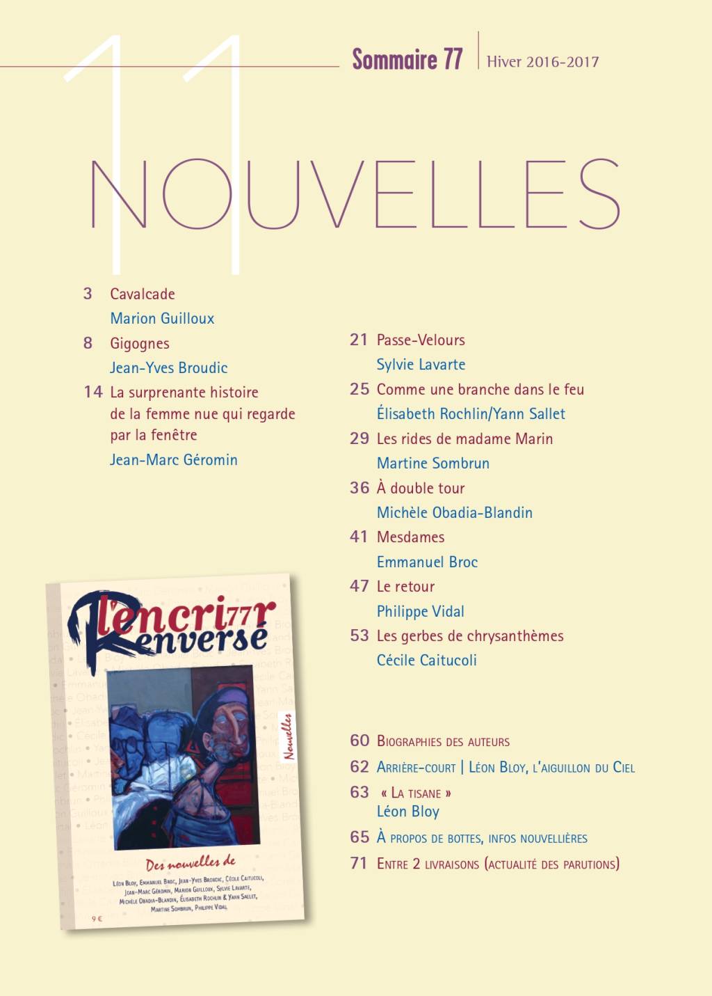 [78 pages] Cavalcade, Marion Guilloux ; Gigognes, Jean-Yves Broudic ; La surprenante histoire de la femme nue qui regarde par la fenêtre, Jean-Marc Géromin ; Passe-Velours, Sylvie Lavarte ; Comme une branche dans le feu, Élisabeth Rochlin/Yann Sallet ; Les rides de madame Marin, Martine Sombrun ; À double tour, Michèle Obadia-Blandin ; Mesdames, Emmanuel Broc ; Le retour, Philippe Vidal ; Les gerbes de chrysanthèmes, Cécile Caitucoli. Rubriques : Arrière-court (La tisane, Léon Bloy), A propos de bottes...