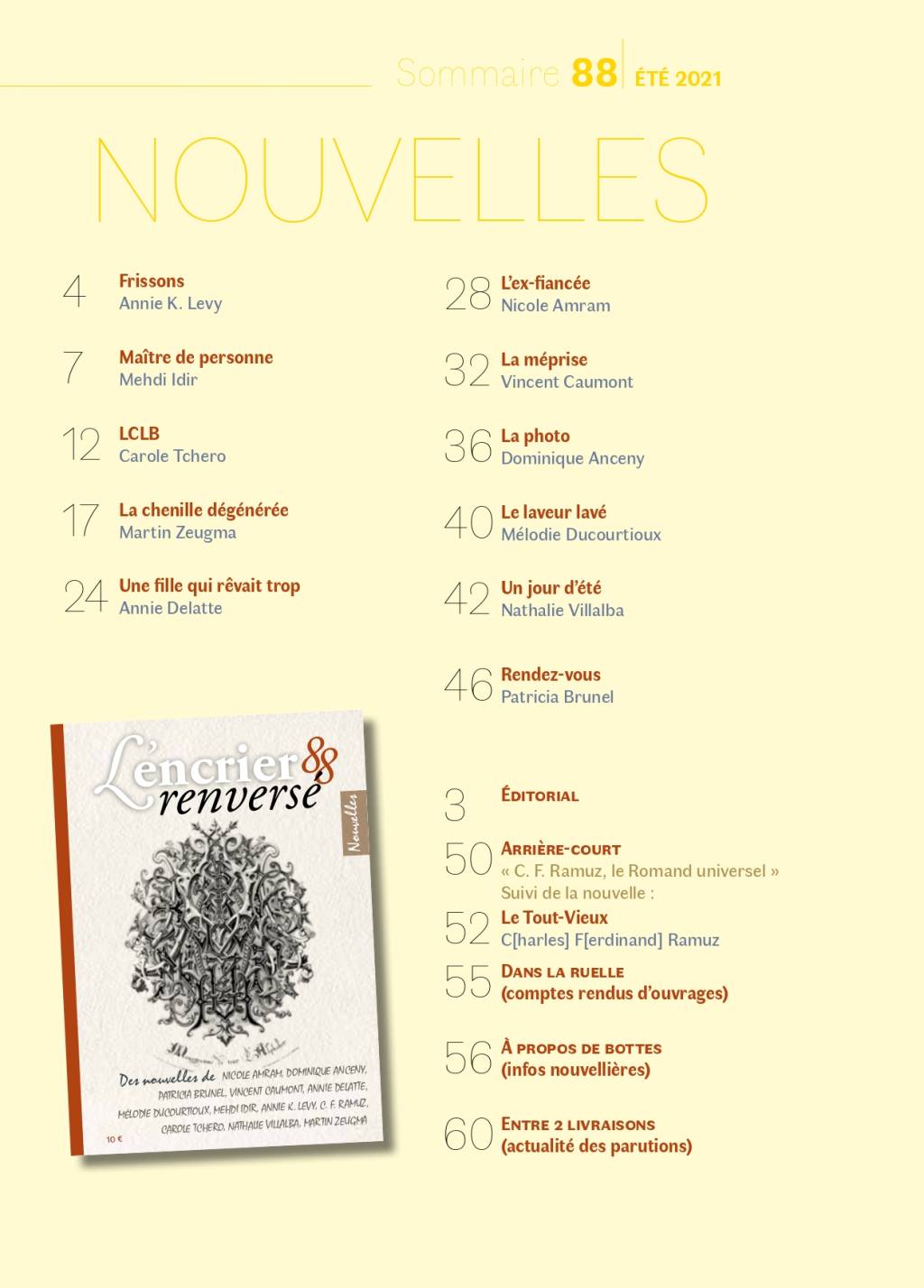 [64 pages] Frissons, Annie K. Levy ; Maître de personne, Mehdi Idir ; LCLB, Carole Tchero ; La chenille dégénérée, Martin Zeugma ; Une fille qui rêvait trop, Annie Delatte ; L’ex-fiancée, Nicole Amram ; La méprise, Vincent Caumont ; La photo, Dominique Anceny ; Le laveur lavé, Mélodie Ducourtioux ; Un jour d’été, Nathalie Villalba ; Rendez-vous, Patricia Brunel. Rubriques : Arrière-court (Le Tout-Vieux, C. F. Ramuz), Dans la ruelle, A propos de bottes...