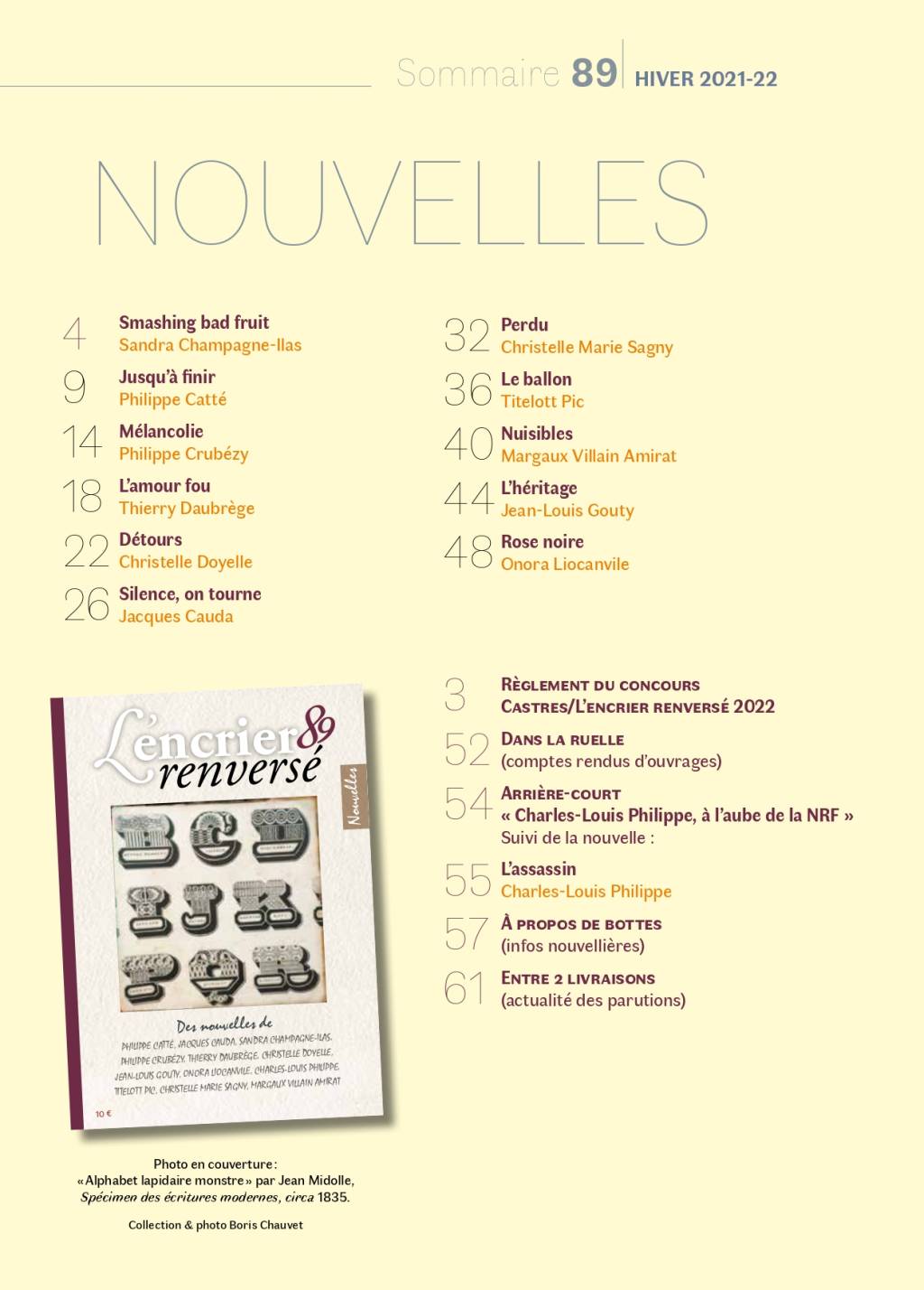 [64 pages] Smashing bad fruit, Sandra Champagne-Ilas ; Jusqu’à finir, Philippe Catté ; Mélancolie, Philippe Crubézy ; L’amour fou, Thierry Daubrège ; Détours, Christelle Doyelle ; Silence, on tourne, Jacques Cauda ; Perdu, Christelle Marie Sagny ; Le ballon, Titelott Pic ; Nuisibles, Margaux Villain Amirat ; L’héritage, Jean-Louis Gouty ; Rose noire, Onora Liocanvile. Rubriques : Arrière-court (L'assassin, Charles-Louis Philippe), Dans la ruelle, A propos de bottes...