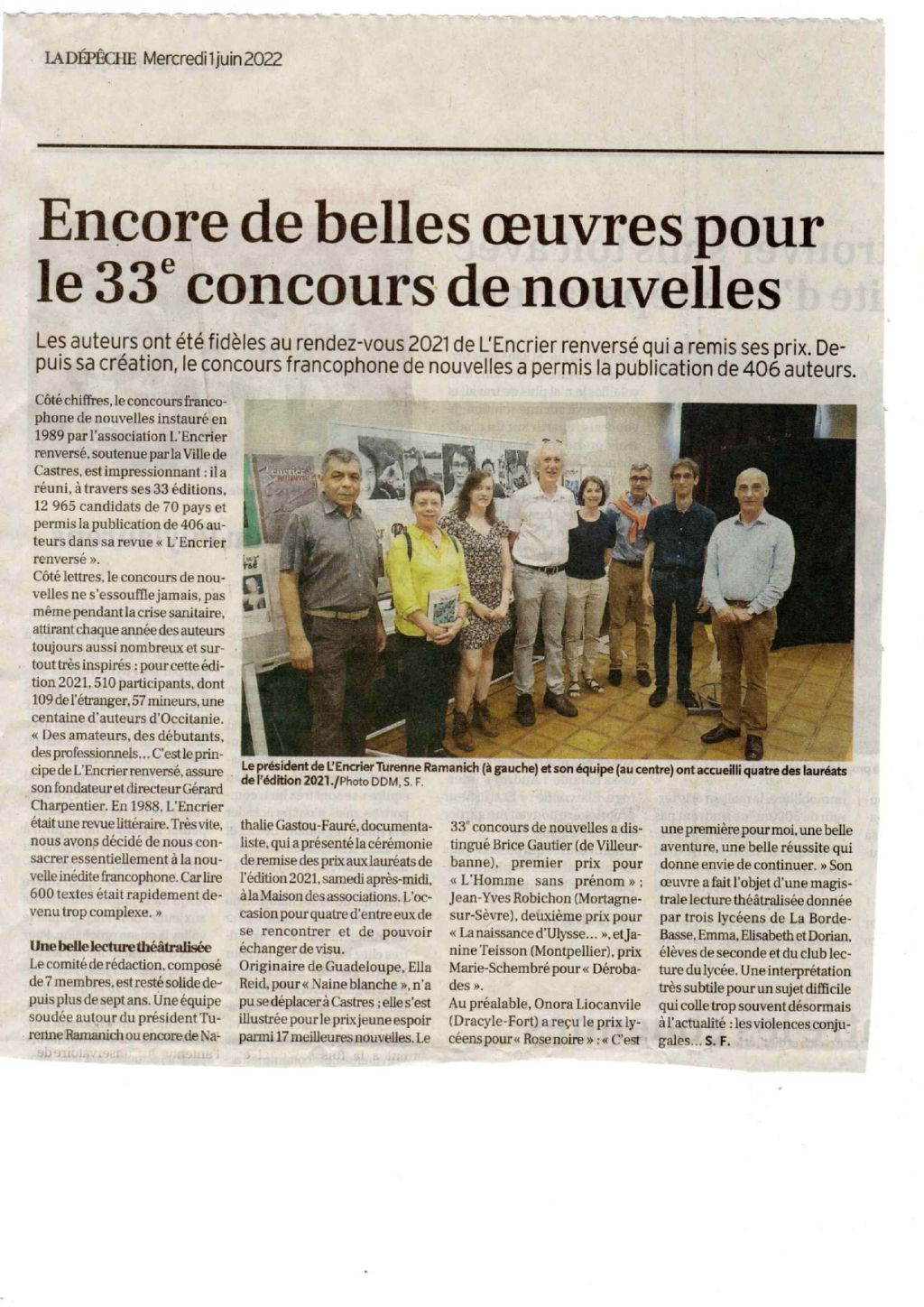 [74 pages] Concours 2021 : L’homme sans prénom, Brice Gautier ; La naissance d’Ulysse, Jean-Yves Robichon ; Dérobades, Janine Teisson ; Naine blanche, Ella Reid ; Bas les masques, Véronique Liégard ; Jour J, Marine Westphal ; La corde et le lien, Alain Parodi ; La dernière ligne droite, Brigitte Dujon ; La vie c’est caillou, Claire Cornet ; Lou, Corine Sylvia Congiu ; Vendredi 13, Christian Laborde. Rubriques : Lauriers et confidences, Arrière-court (Le cocher de Reims, Paul Wenz), Dans la ruelle, A propos de bottes...