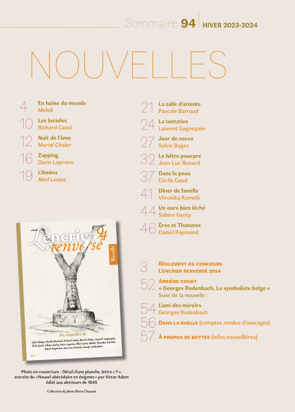[62 pages] En haine du monde, Mehdi ; Les lucioles, Richard Canal ; Nuit de l'âme, Muriel Chaler ; Zapping, Dario Lopreno ; L'Amina, Abel Louise ; La salle d'attente, Pascale Barraud ; La tentative, Laurent Gagnepain ; Jour de noces, Sylvie Bages ; Le hêtre pourpre, Jean-Luc Renard ; Dans la peau, Cécile Gaud ; Dîner de famille, Véronika Ramelli ; Un ours bien léché, Sabine Genty ; Eros et Thanatos, Daniel Raymond. Rubriques : Arrière-court (L'ami des miroirs, Georges Rodenbach), Dans la ruelle, À propos de bottes…